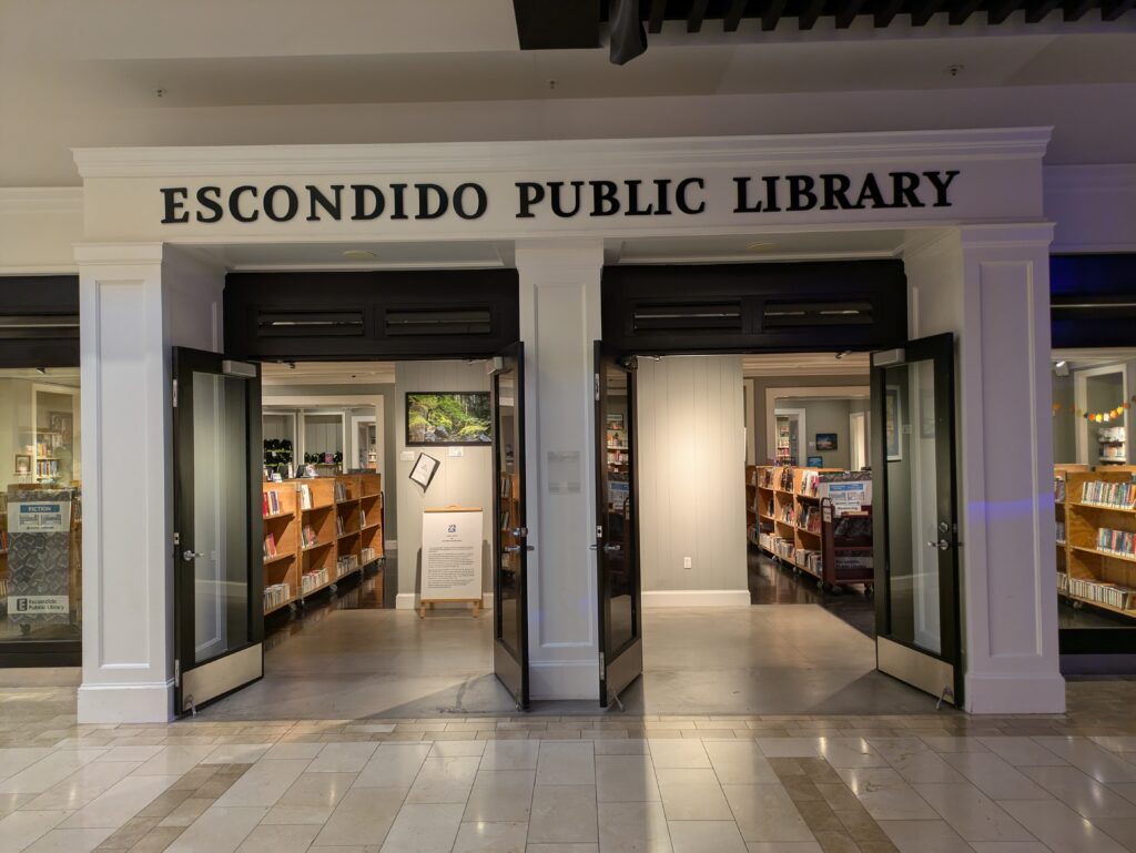A stopover on a trip to the San Diego Zoo Safari Park, yet another library at a temporary location— this time a rather unique one in a shopping mall. I only got to go into the Childrens’ library, but between the adult section, childrens’ section, and friends bookstore, they had three storefronts together.